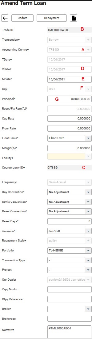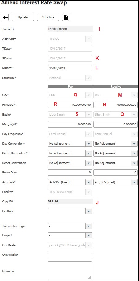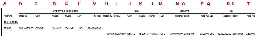 4. The report shows the Term Loan and IRS Accounting Centre, TradeID, Counterparty, VDate and MDate, Ccy, Principal, Hedge %, Receive Ccy, Notional, Basis, Rate % and Pay Currency, Notional, Basis and Rate%.