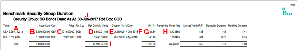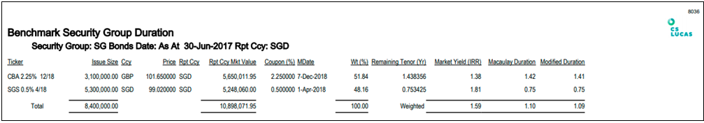 4. The report shows the Ticker, Issue Size, Currency, Market Price, Reporting Currency, Market Value in reporting currency, Coupon (%), MDate, Weighting (%), Remaining Tenor (Yr), Market Yield (IRR), Macaulay Duration, Modified Duration.