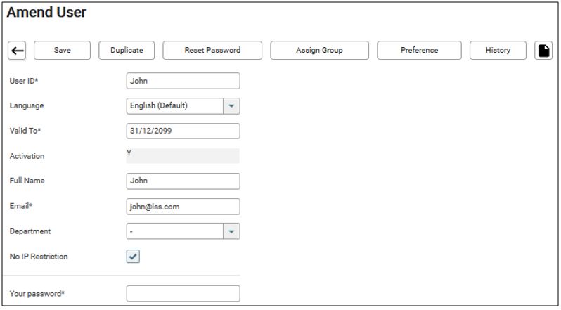 8. The password has successfully changed. You will be returned to Amend User screen, click Back Button to return to User screen.