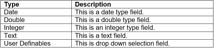 9. Choose the Field Type from the dropdown. The types that you can select are as follows: