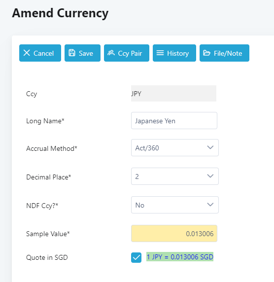 3. The system will display the Amend Currency screen of JPY.