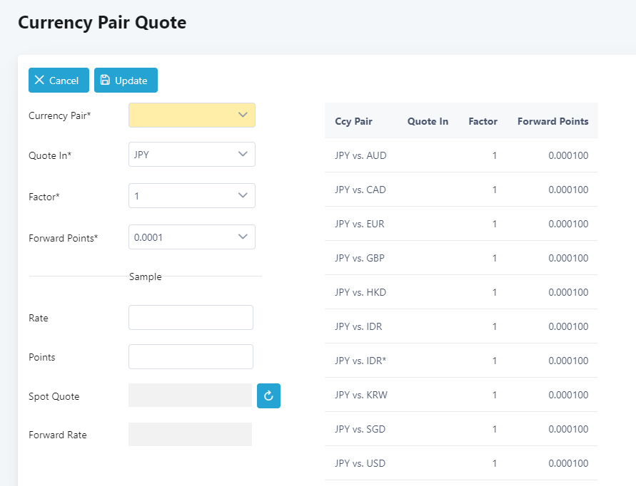 11. To save the quote set up, click Update. The system will refresh and the currency pair quote will be updated on the right side of the screen.
