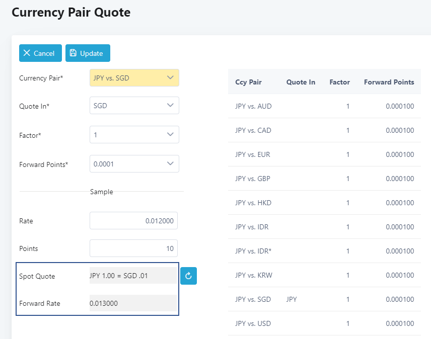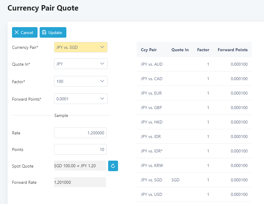 Some currencies like Japanese Yen or JPY are sometimes quoted in factors of 100. Select the factor as 100 and key in the sample rate expressed in 100 units of JPY. When the sample quote is recomputed, the Spot Quote will be shown as 100 JPY = 1.2 SGD because setting the factor to 100 will mean 100 units of that currency will always be used. The screen below is an example.