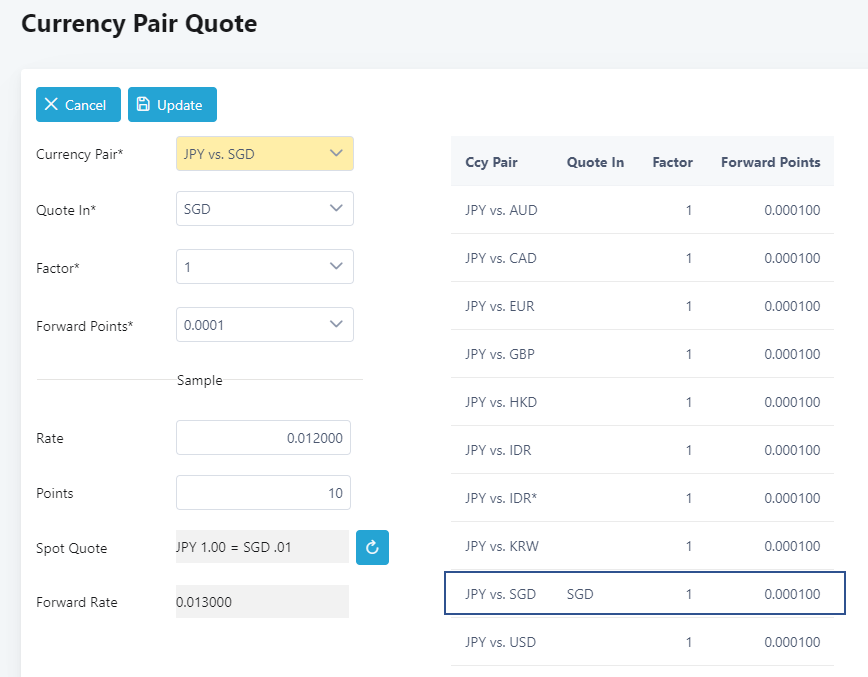 Forward point is used to compute the forward rate. Using JPY vs SGD as an example, select Forward Points as 0.01 and under Sample enter 10 in the Points field. Click on Recomp button. The Forward rate will be computed. The system will multiply the Points (10) with Forward Points (0.01) and will add this to the Rate, which is 1.2 in this example. That will make the Forward Rate 1.3.