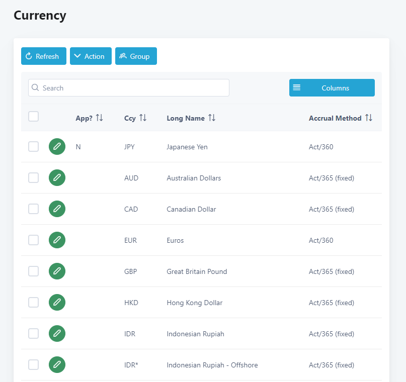 13. On the Currency main screen, a letter N shows in the row of the currency which was amended. Click on the tick box beside it.