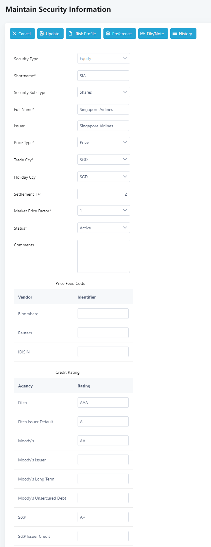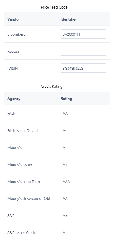 16. Users may also maintain the following credit ratings from Bloomberg. The following Bloomberg codes will be used for the ratings show on this screen. Ratings imported from the Prices > Price Load will be displayed here. For more details on how to get prices from Bloomberg, click here.
