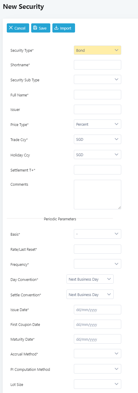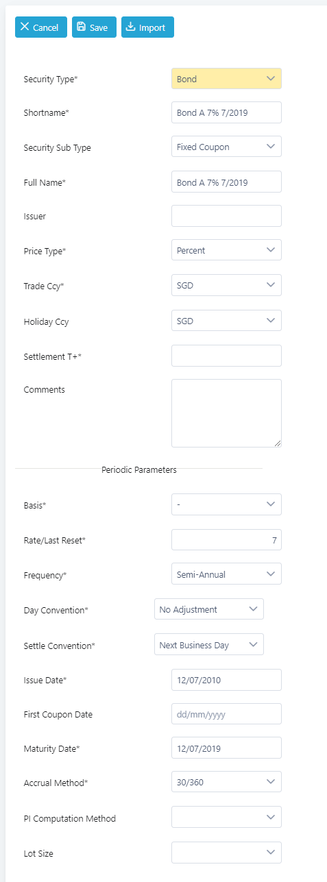 11. Next, fill in the Periodic Parameters section. Select the basis for floating rate note or variable rate note. This field is user definable. Click here to see how to set up user definable field. For fixed coupon, create a “Fixed” as one of the option in the user definable list.