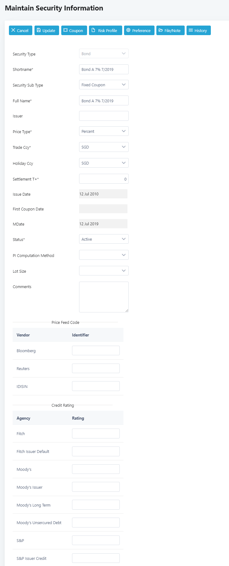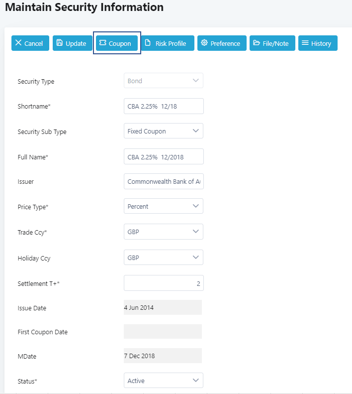 Once the Bond security is created, you can change the maturity date by amending the coupon schedule. Drill down the Bond security and click on the Coupon button in the Maintain Security Information screen.