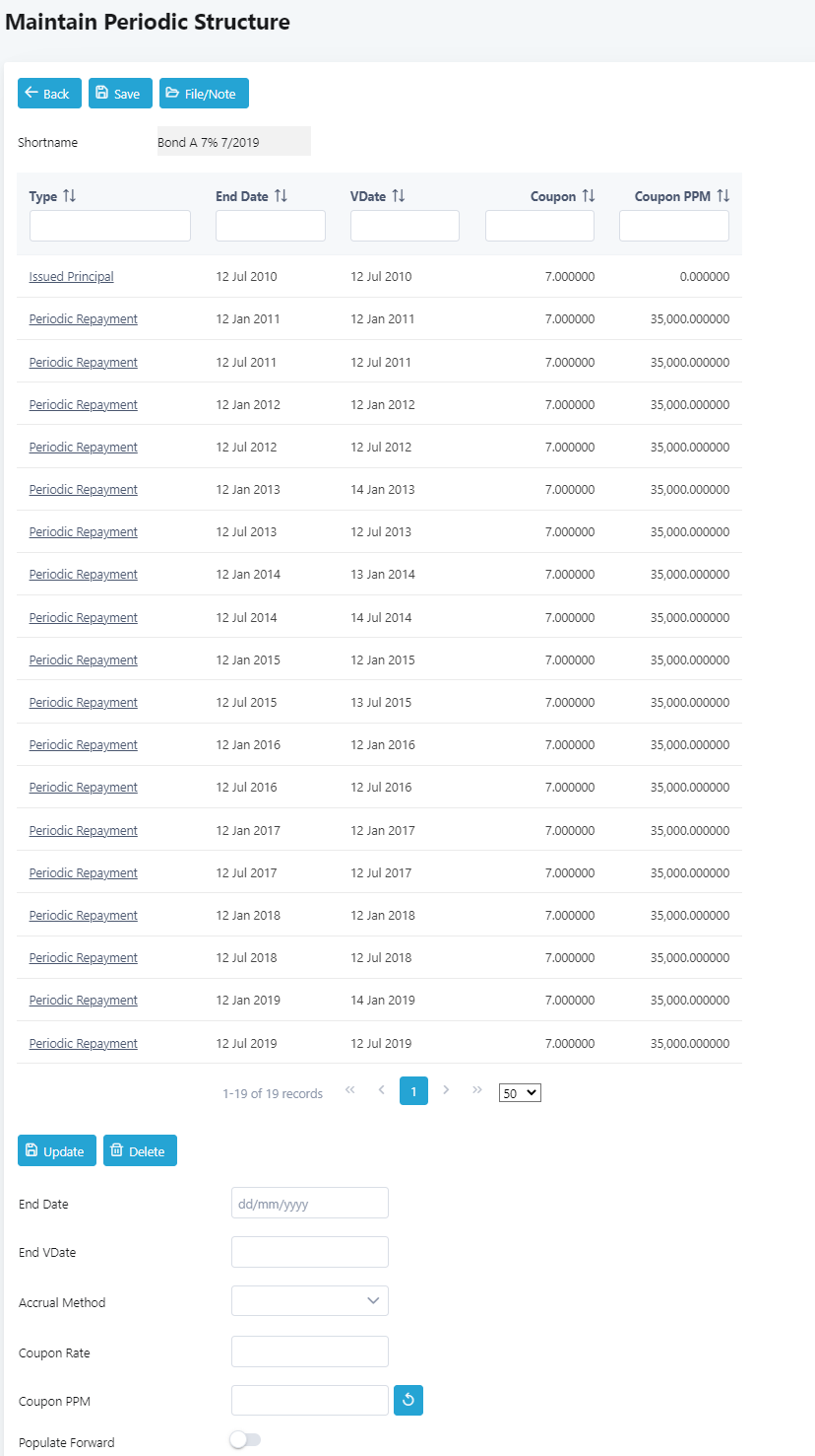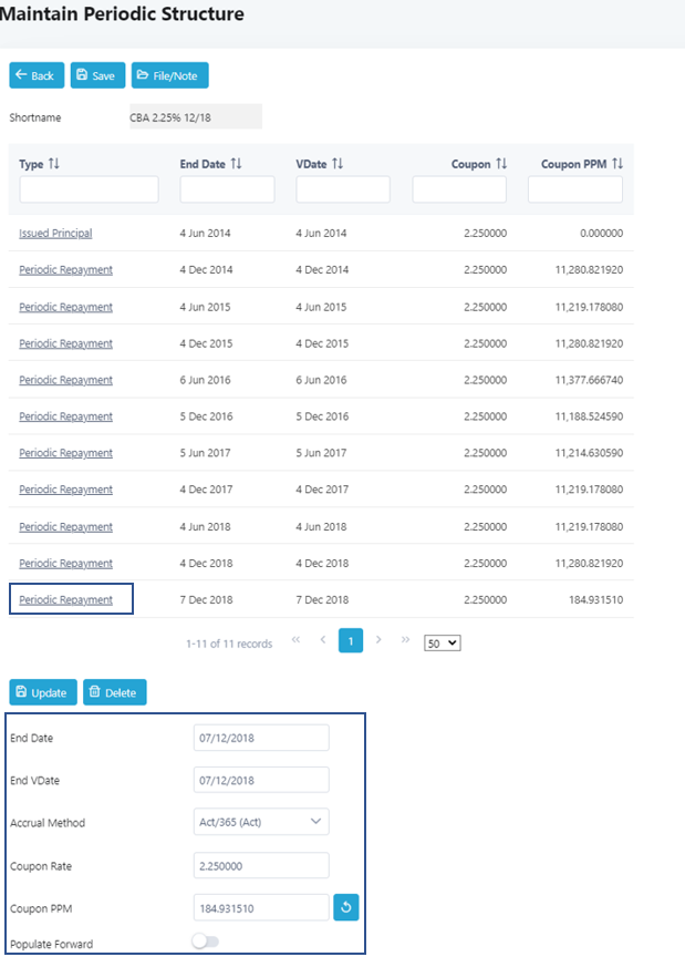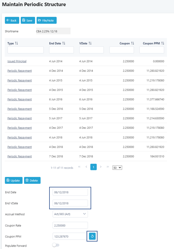 28. To make changes to the coupon schedule, click on the periodic item hyperlink under Type field (e.g. VDate 12 Jan 2017). Make the necessary changes to the dates, accrual method, coupon rate and coupon PPM accordingly. To recalculate the coupon PPM based on dates, accrual method and coupon rate, click on the Recompute button next to Coupon PPM field. Tick on Populate Forward checkbox if you wish the coupon rate to be populated forward. Click Update and Save once done.