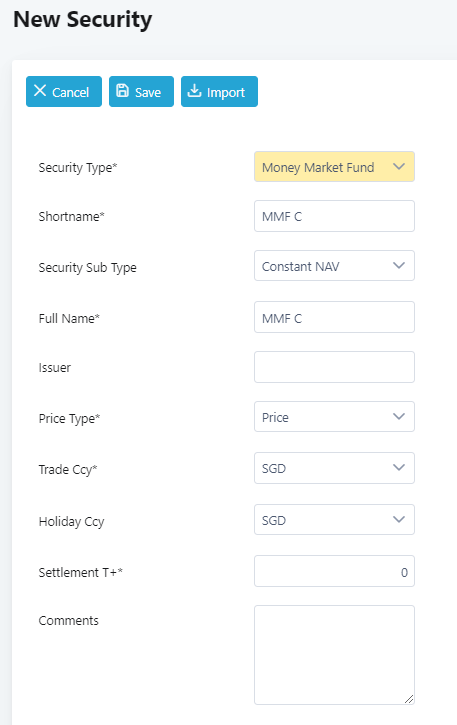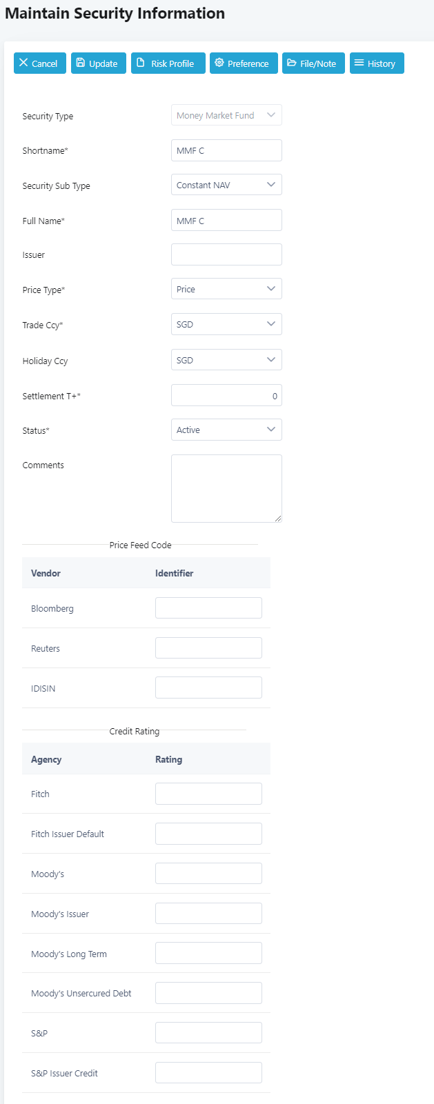 3. Select the Security Type as Money Market Fund (MMF). The following screen display.