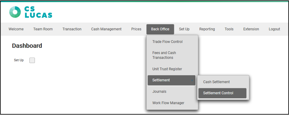 Tip: If you do not see Settlement Control in the menu navigation, please ensure that you have the access rights to access this screen. Access rights required is 19500 Access Settlement Control.