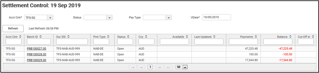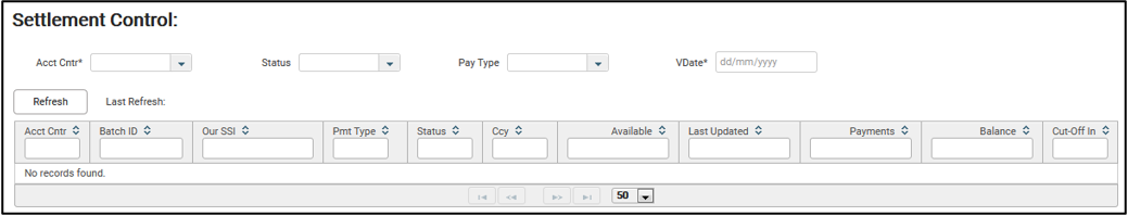 3. To view the payment requests submitted for payment processing in Settlement Control screen, select the Acct Cntr and VDate. Click Refresh.