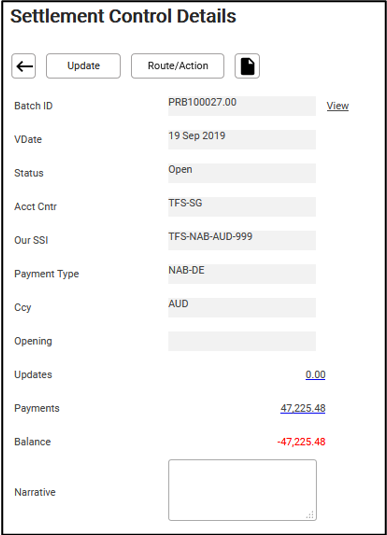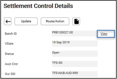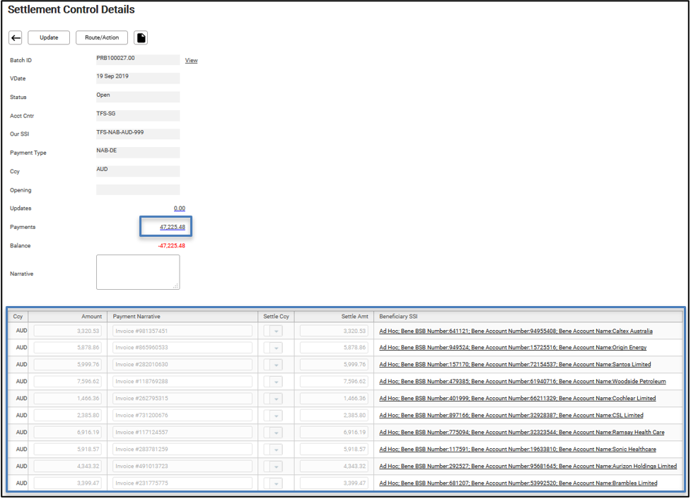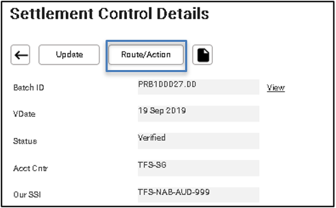 14. Once verified, authoriser can authorise the payment batch. Click on the Batch ID to drill down to Settlement Control Details screen, click Route/Action.