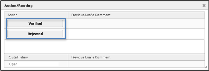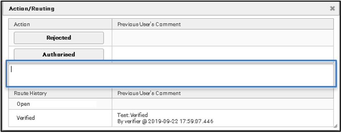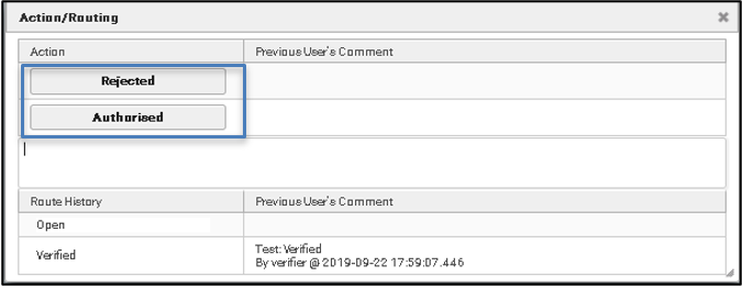 Tip: If you do not see action buttons in the popup box, this means you do not have the permission rights to do any action. See permission set up in Work Flow Manager.
