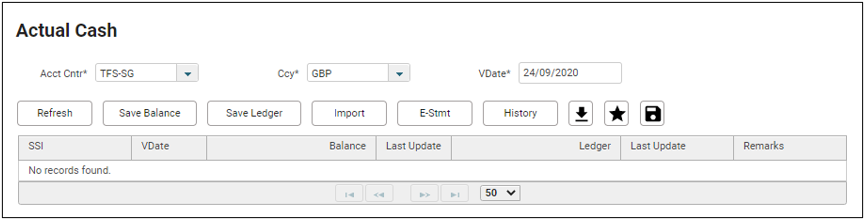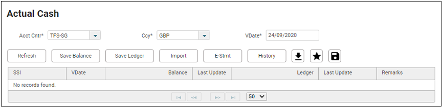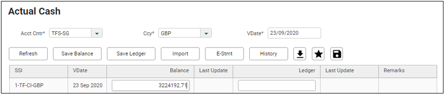 10. Click on the Back button to return to Actual Cash screen. Balance is updated for TF-CI-GBP. Balance update from the Actual Cash screen can be disabled by setting Auto Balance Update to Yes in accounting centre SSI details, see Accounting Centre SSI Set Up.