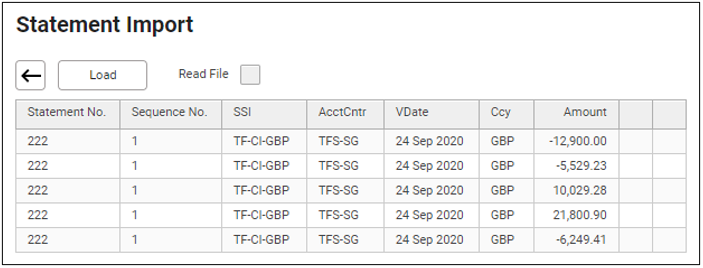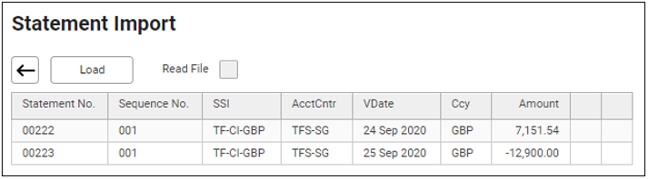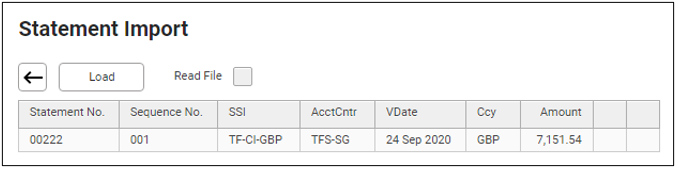 20. System will read all the activities available in MT940 file and display on the import screen by VDate. Amount displayed is the total activities/movement by SSI and VDate. If there are no errors, system will display the Load button.