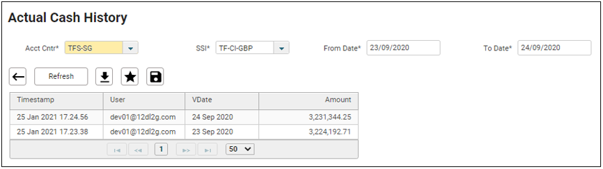 12. On the Actual Cash History page, select the accounting centre, SSI and dates. Click on Refresh button. This page shows all the changes done for this SSI’s Actual Cash for the dates selected. You can also export this table to excel by clicking on the button.