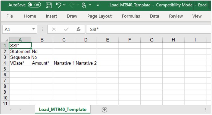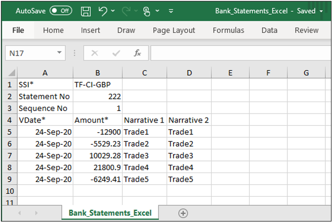 29. Fill out the fields in the import template. Enter SSI short name, statement number, sequence number, VDate, Amount, Narrative 1 and Narrative 2.