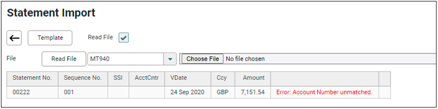 System will show “Error: Account number unmatched.” When this SSI is set up, try to read the MT940 messages again.