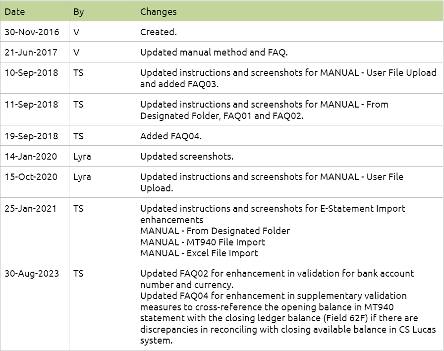 a) The Opening balance (Field 60F) in the MT940 statement tally with the previous closing available balance (current value date balance) in CS Lucas system. If there is a discrepancy in reconciling the closing available balance, CS Lucas system will then cross-reference it with the closing ledger balance (Field 62F, as provided in the statement) stored within the CS Lucas system.