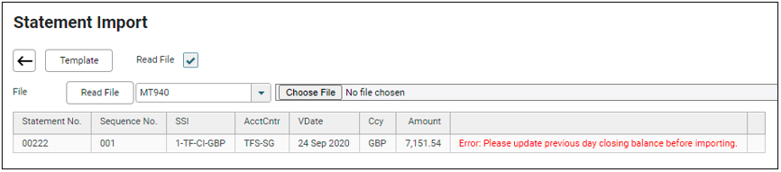 If there is no previous day closing balance available and you are trying to do a manual import, you will see the following error message.