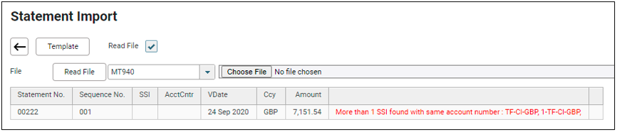 System will show “Error: More than 1 SSI found with same account number.” System will also display the SSIs with the same account number and currency. Resolve this duplicate SSI and try to read the MT940 messages again.