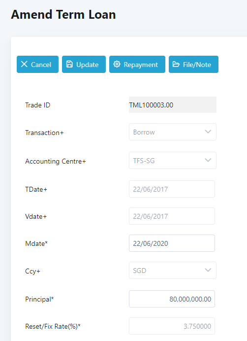 7. Click on the Cancel button to return to the Term Loan launch screen. Click on the trade that was updated.
