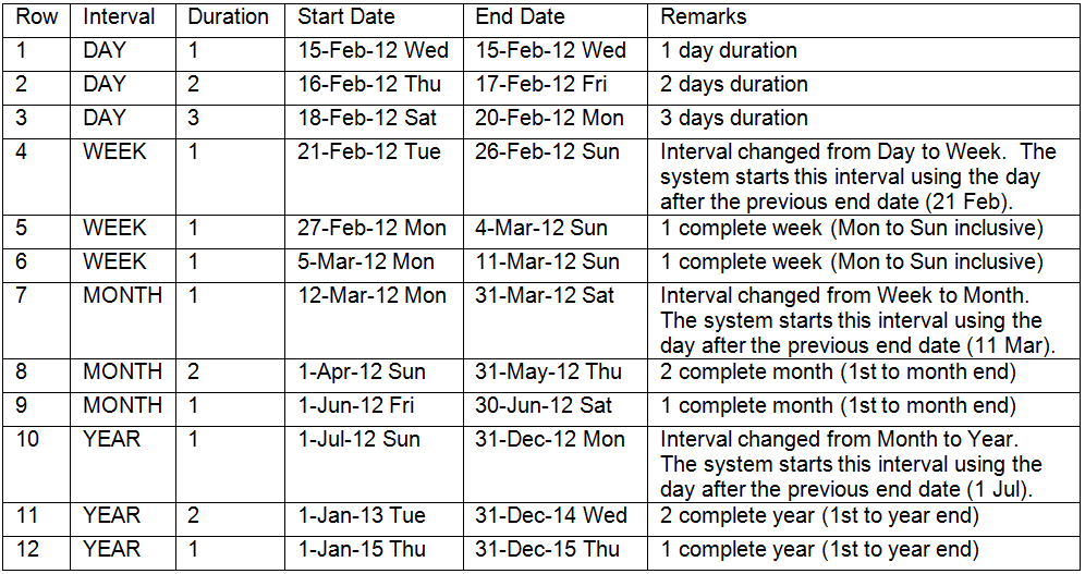 3) Since the interval between consecutive rows change, the system will, if necessary, shorten the subsequent (and larger) interval to accommodate this change. This may result in a period that is shorter than the stated interval for that period.