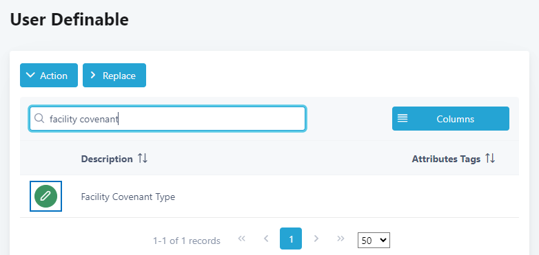 2. Look for Facility Covenant Type in the list of user definable. Click on the Edit button.