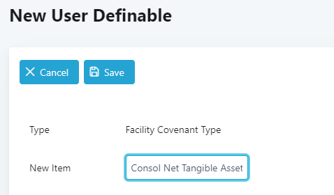 4. Key in the facility covenant you wish to create in the New Item field. In this example, we will create Consolidated Net Tangible Assets.