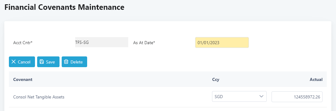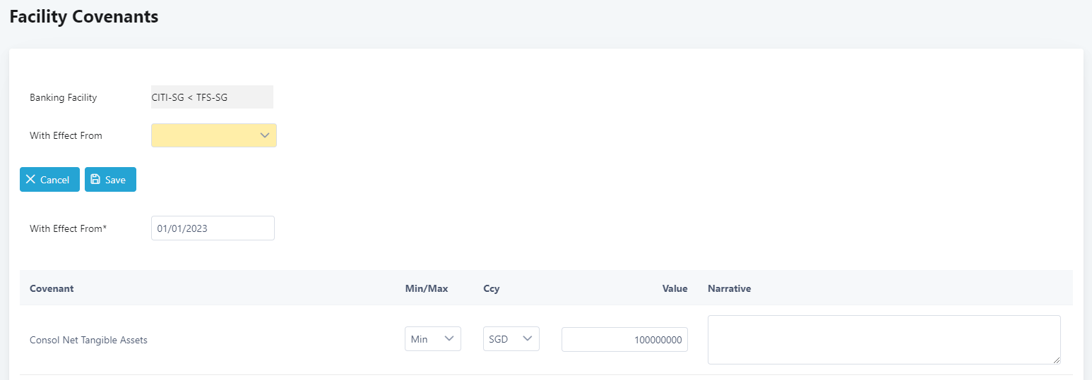 8. Key in the facility covenant rules in the screen provided. In this example, we will create consolidated net tangible assets must be more than or equal to S$100 million. First, key in the With Effect From field to indicate the effective date. Select Min/Max as Min, SGD as the currency and 100 million under Value field for the respective covenant rule.