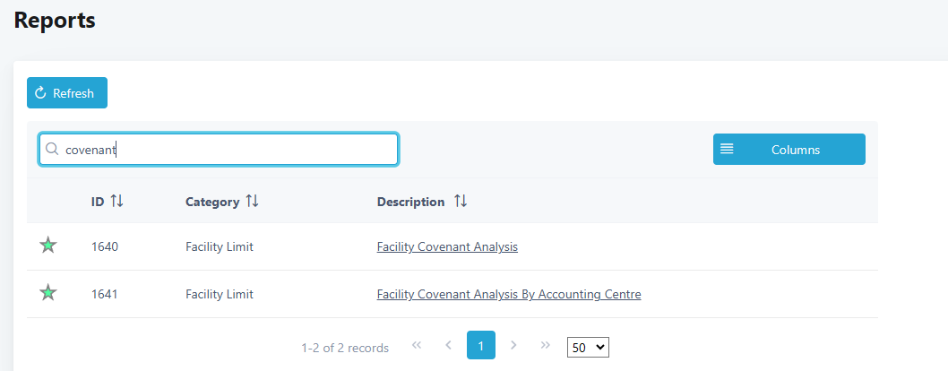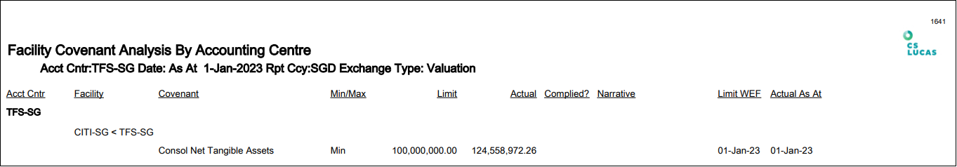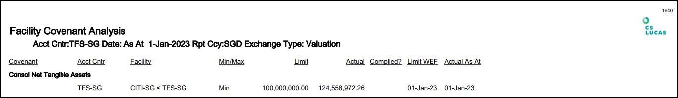 15. To check if the financial covenants complied with the facility covenant rule set up, user may print the following reports under Reporting. Note that report will indicate “N” if the rule is not complied.