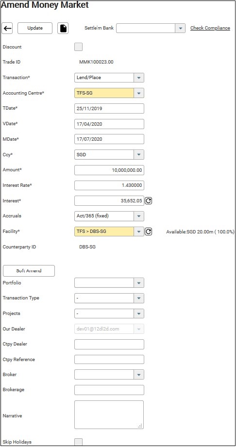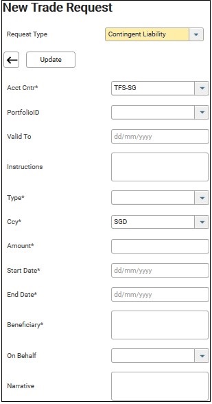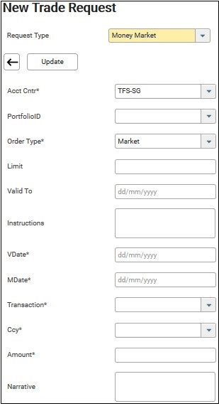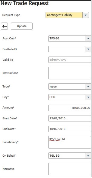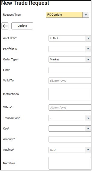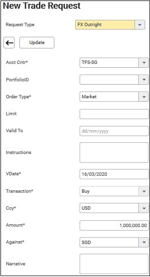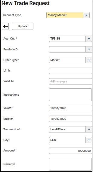 21. Make the necessary change in the Amend Trade Request screen and click Update when done.