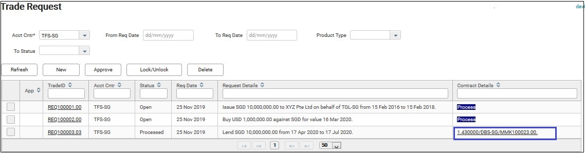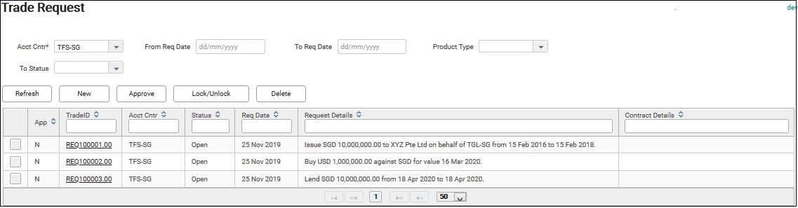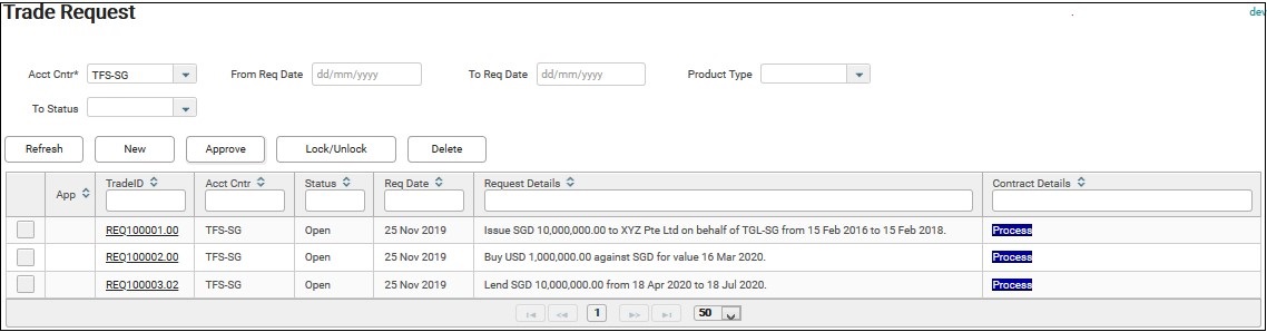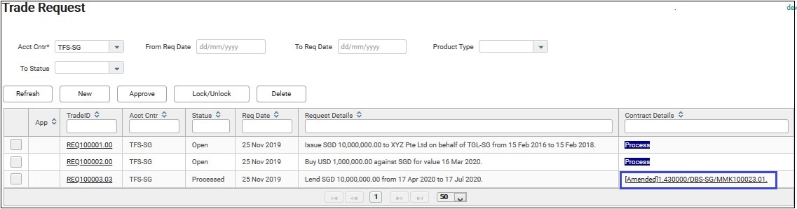 Note: A locked trade request cannot be amended and must be unlocked. To unlock, select the checkbox of the trade ID and click Lock/Unlock. The status will change to “Open” again.