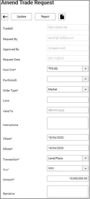 22. If you wish to reject the trade request, click the Reject button in the Amend Trade Request screen. Once the trade request has been rejected, you can reopen by drilling down to the Amend Trade Request screen.