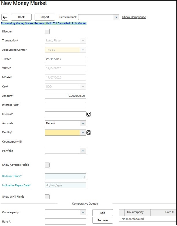 26. The information as per the trade request will be populated in the respective fields in New Money Market screen. Fill out the rest of the required fields like interest rate, interest and facility and click Book. Other fields are optional but you may input if any.