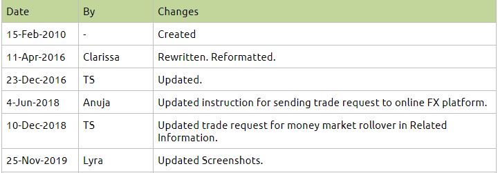 This document describes the procedure on how to create, amend, approve and process trade request for Money Market, Foreign Exchange and Contingent Liability – Issue Guarantee.