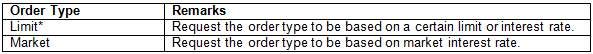 Note *: If limit is selected, a limit can be specified at the Limit field. For example, specify the interest rate requirement for the money market trade.