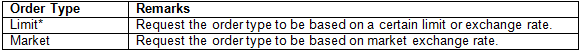 Note *: If limit is selected, a limit can be specified at the Limit field. For example, specify the exchange rate requirement for the foreign exchange trade.