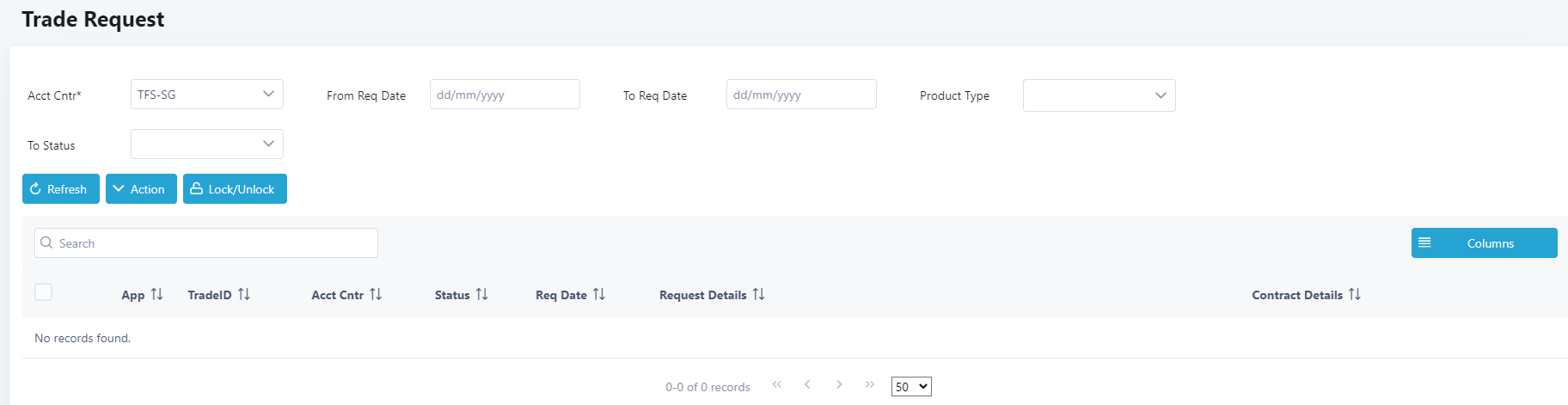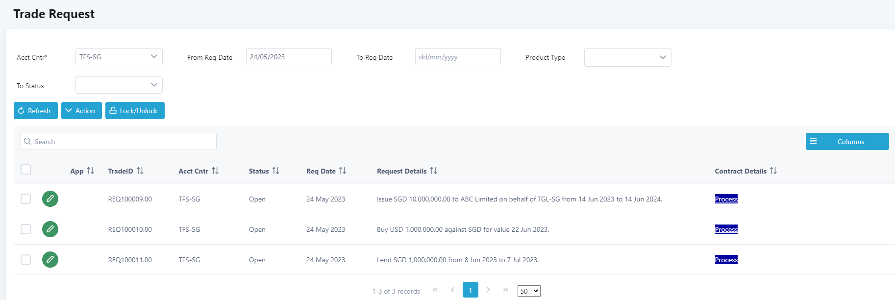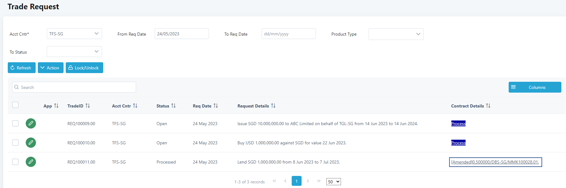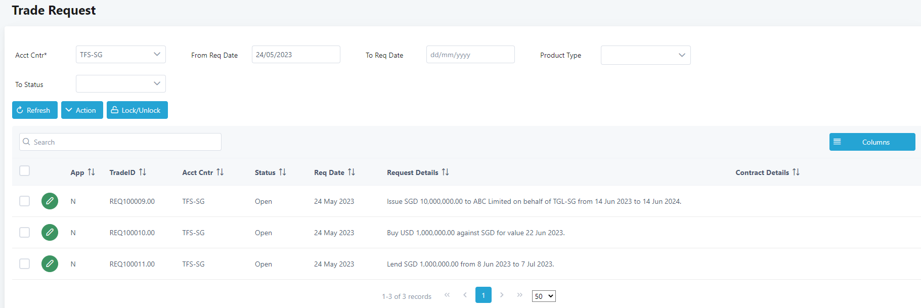 Note: A locked trade request cannot be amended and must be unlocked. To unlock, select the checkbox of the trade ID and click Lock/Unlock. The status will change to “Open” again.