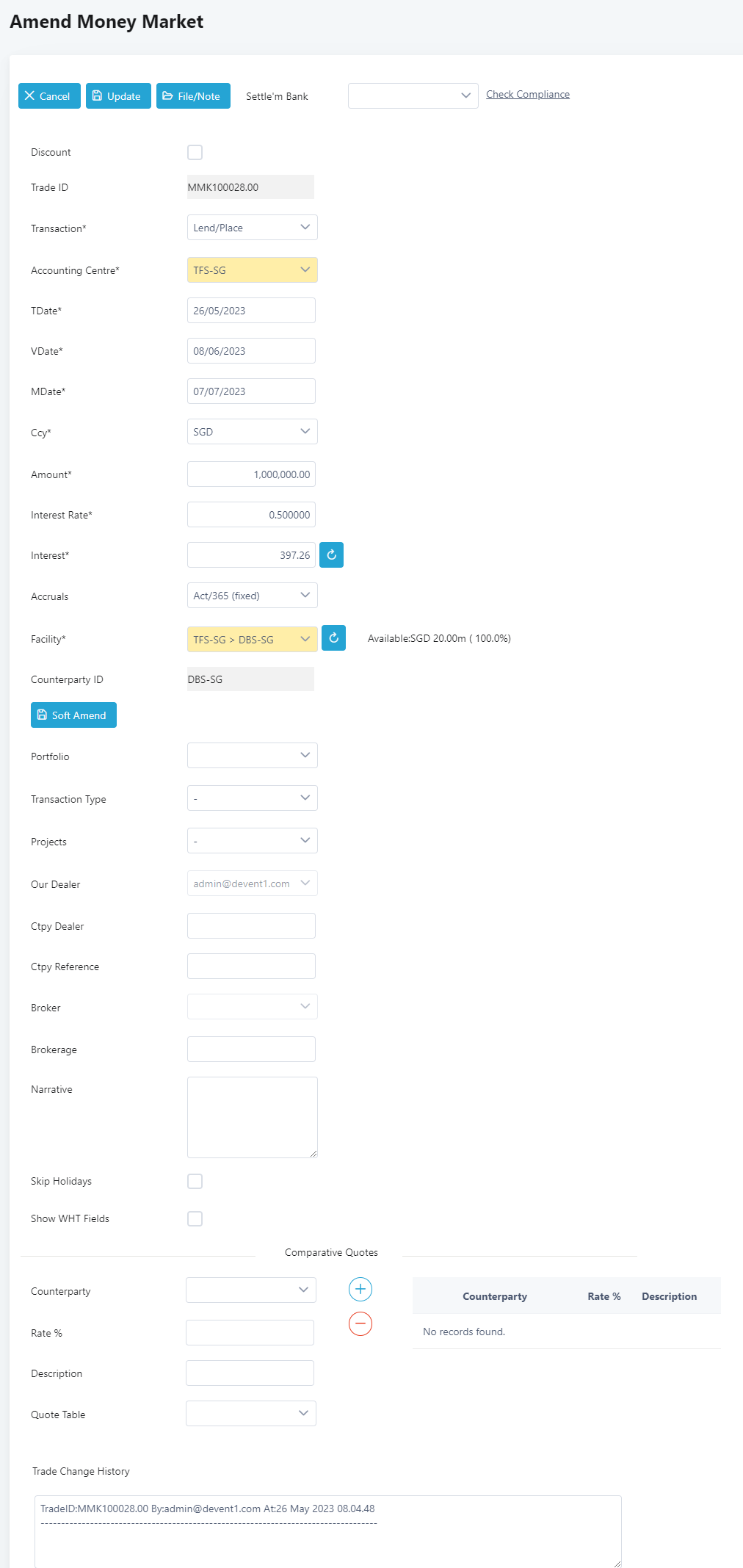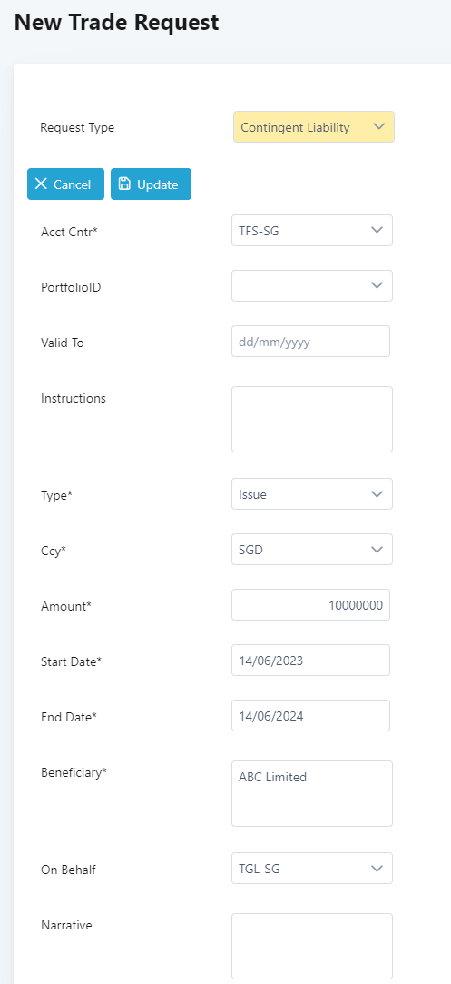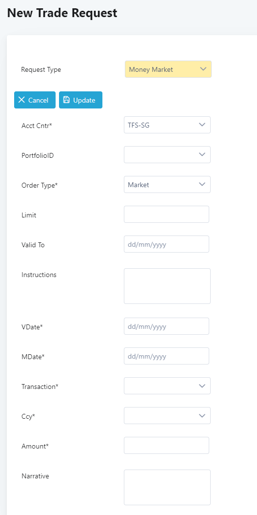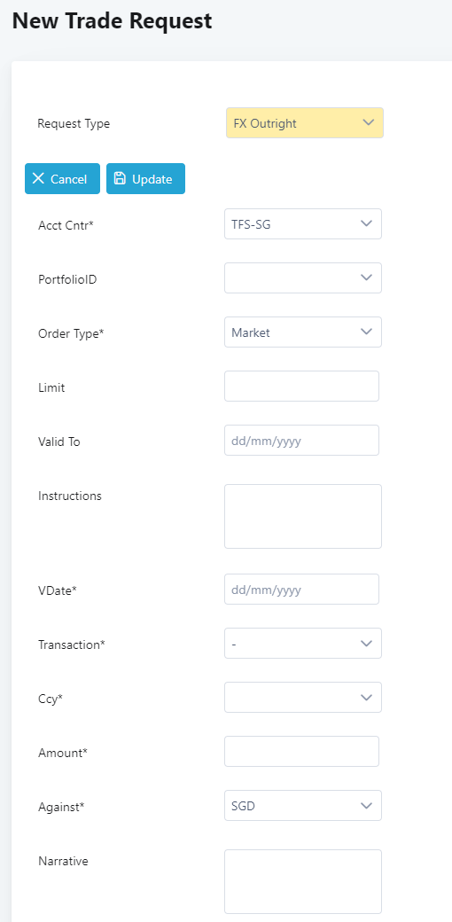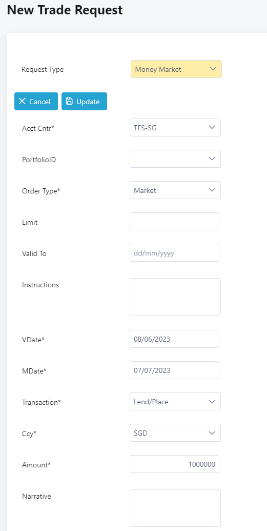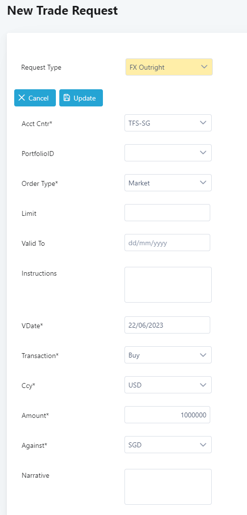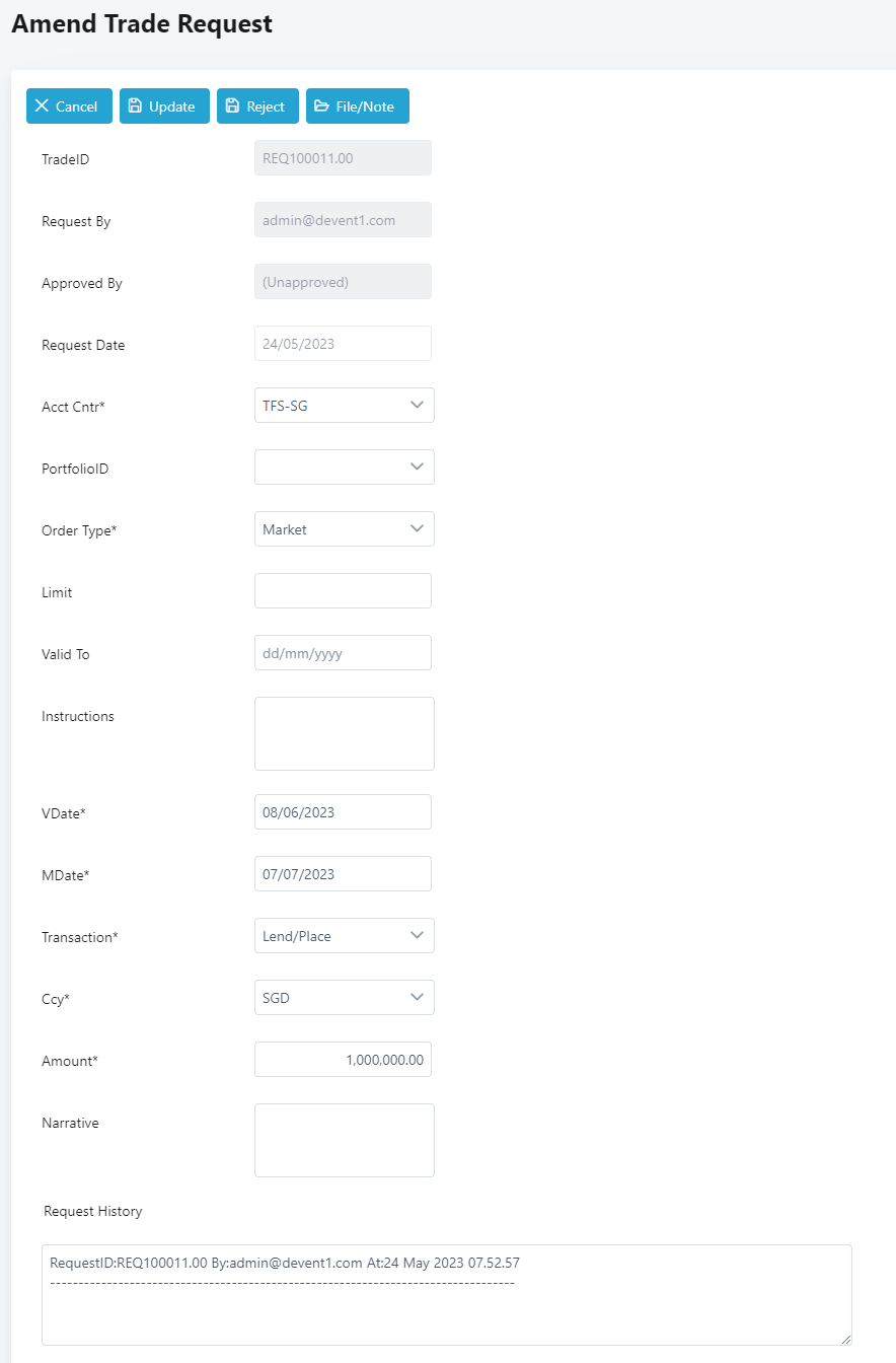 21. Make the necessary change in the Amend Trade Request screen and click Update when done.