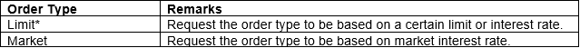 Note *: If limit is selected, a limit can be specified at the Limit field. For example, specify the interest rate requirement for the money market trade.