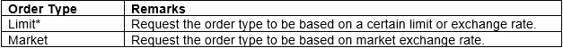 Note *: If limit is selected, a limit can be specified at the Limit field. For example, specify the exchange rate requirement for the foreign exchange trade.