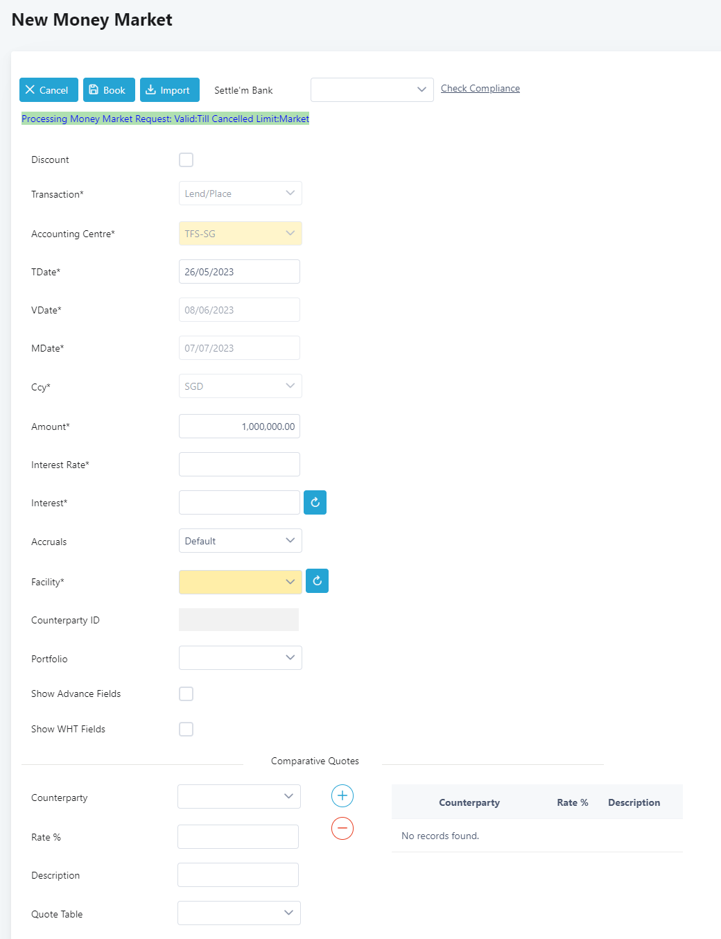 26. The information as per the trade request will be populated in the respective fields in New Money Market screen. Fill out the rest of the required fields like interest rate, interest and facility and click Book. Other fields are optional but you may input if any.