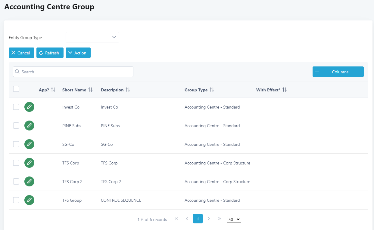 5. Click on the Edit button of the accounting centre group to drill down to the Amend Accounting Centre Group screen.