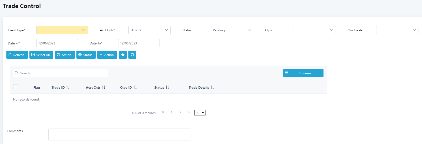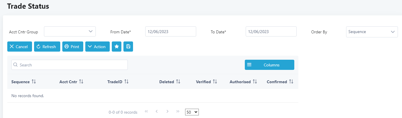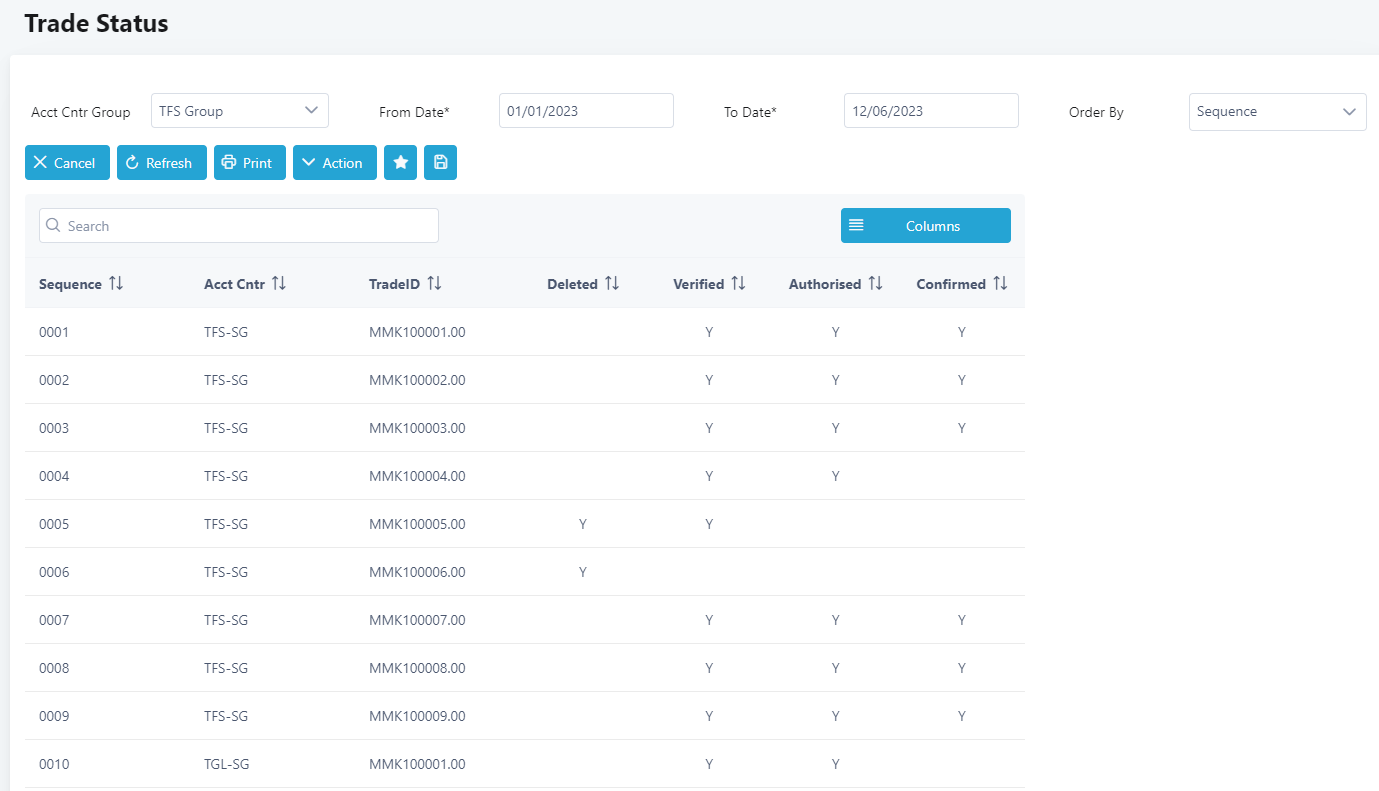 Trade Status screen allows user to view the status for all trades done by the entities in the system to check whether the trade has been authorised, verified, confirmed or deleted to ensure the completeness.