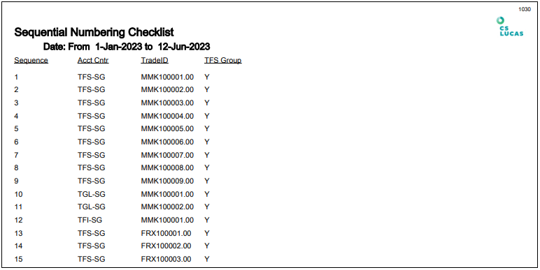 14. Click Print to print a control checklist report which list out all the trades booked by the accounting centres in the CONTROL SEQUENCE group in running sequence number. This is to check that there is no missing trades in the system by checking the running sequence number is in order.