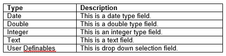 7. Then, choose the types of field you wish to create in the Type drop down field. The field types that you can select are as follows: