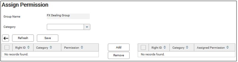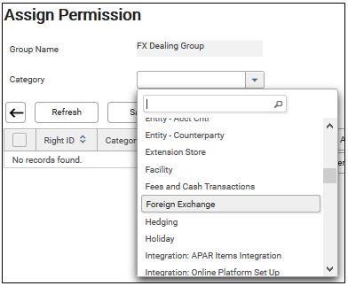 10. Clicking Refresh will list all the access user rights. In this example, the rights will only be set for the Foreign Exchange module.