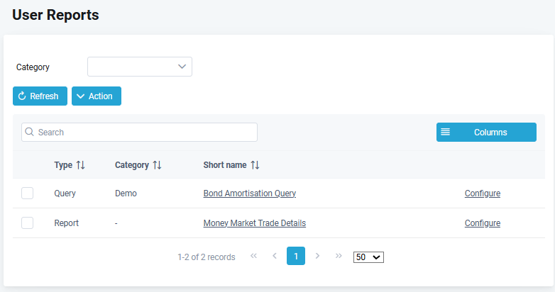 4. To print user report, click the short name of the desired user report from the User Reports screen. For example, Money Market Trade Details.